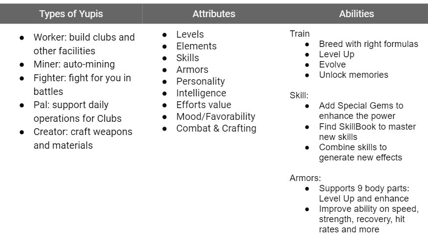 The stars of the show are called Yupis. These are virtual monsters that players can collect, breed, train, and strengthen. A well-trained Yupi can provide assistance to you in winning PvP battles, crafting weapons and materials, and aiding in club building. Each Yupi possesses a unique personality and skill set, showcasing their individuality. They exhibit intelligence by learning and making decisions, while also displaying caring tendencies and occasional moodiness.